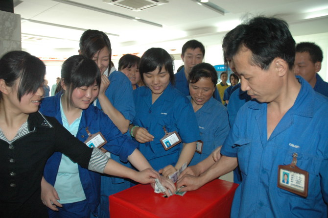 22日下午1点,近500名员工在大江控股集团六楼大会议厅里排起了长龙,自发为灾区人民捐款,现场气氛空前高涨,集团领导班子首先捐款,员工们依次将爱心捐款放进捐款箱里。
